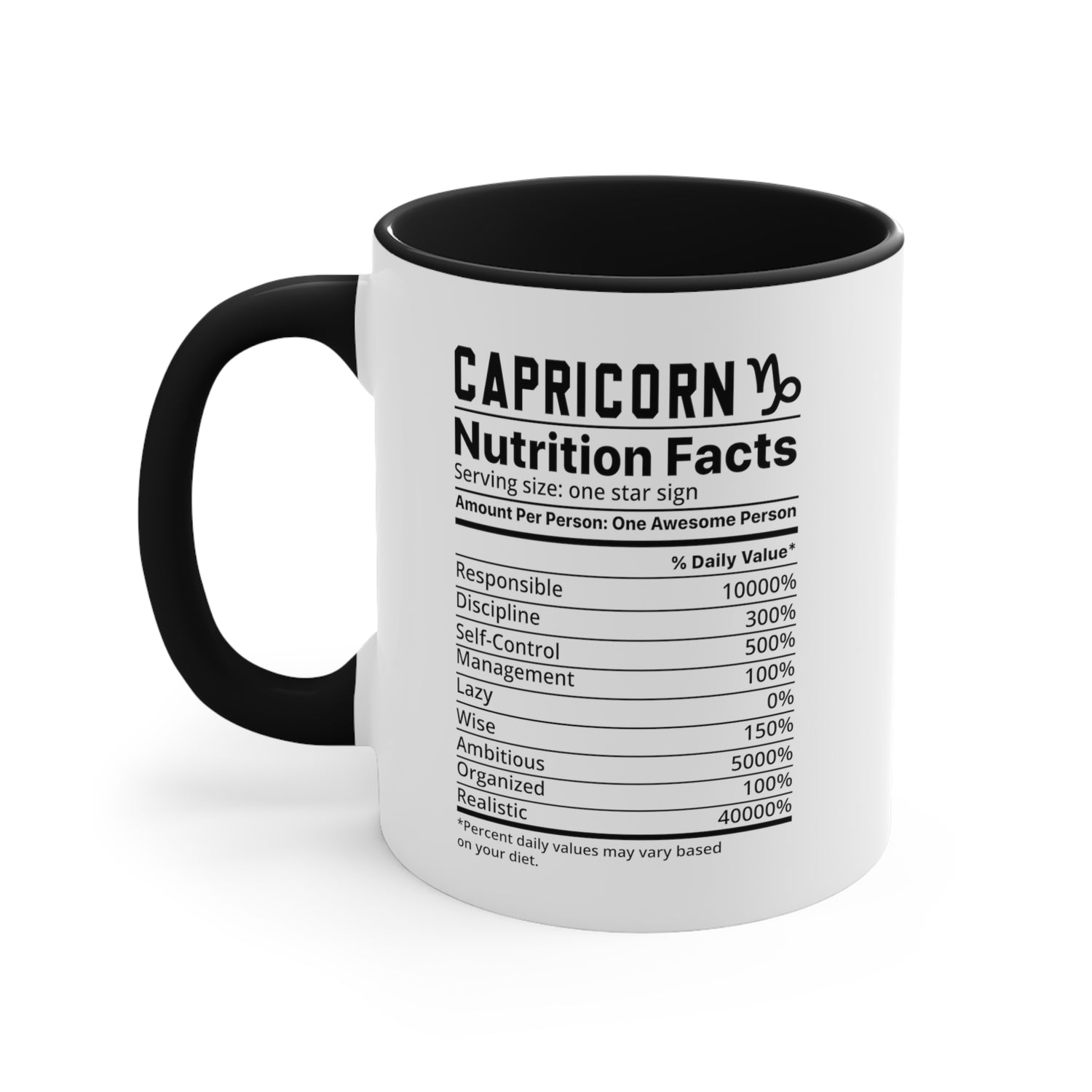 Capricorn Star Sign Nutrition Facts White Black Accent Ceramic Mugs 11oz, Zodiac, Astrology, Celestial, coffee mug, tea cup, joke, funny, humorous, fun