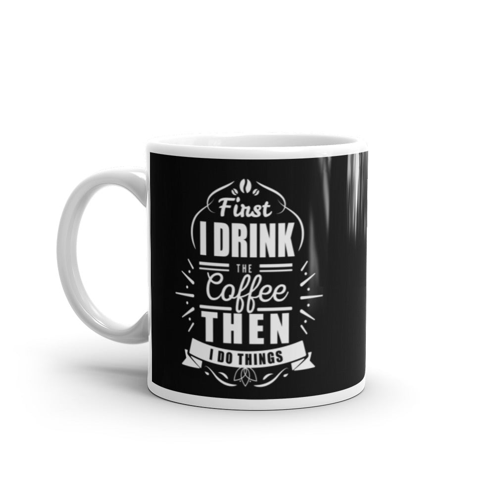 First I Drink the Coffee Then I Do Things (Black) White glossy mug