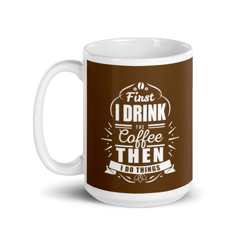 First I Drink the Coffee Then I Do Things (Brown) White glossy mug
