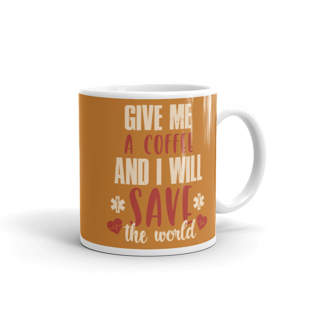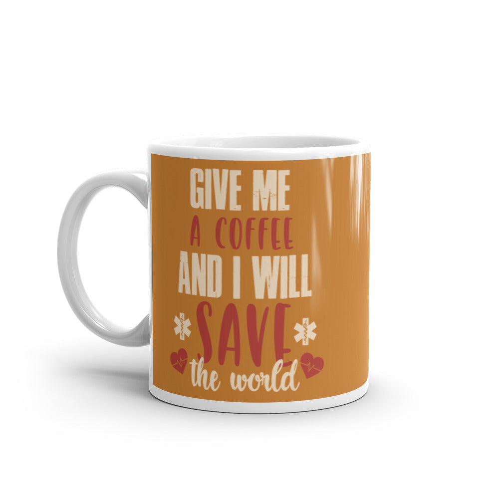 Give Me a Coffee and I will Save the Wold (Bronze) White glossy mug