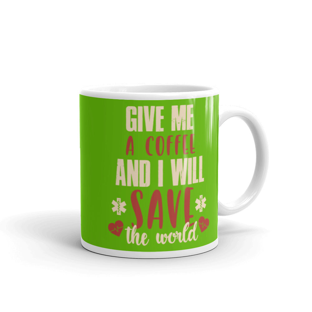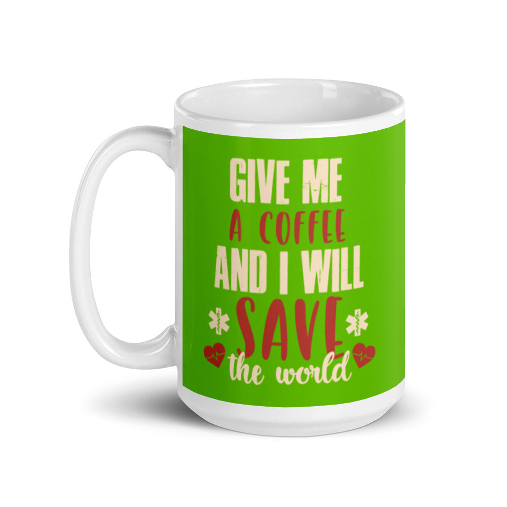 Give Me a Coffee and I will Save the Wold (Green) White glossy mug