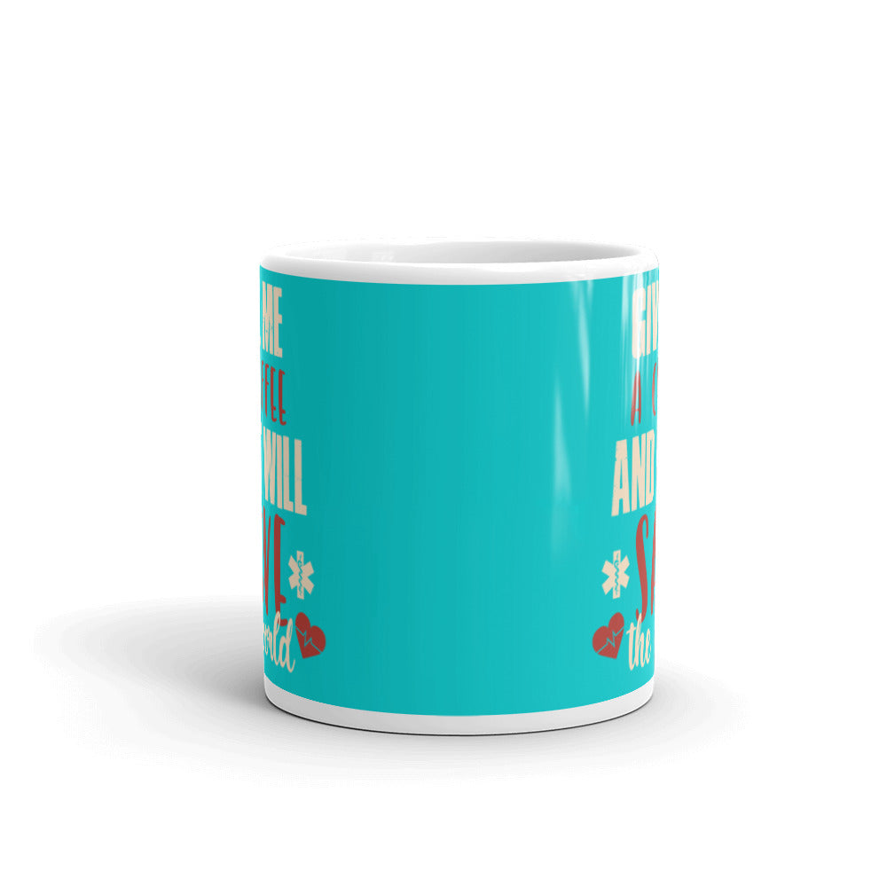 Give Me a Coffee and I will Save the Wold (Turquoise) White glossy mug