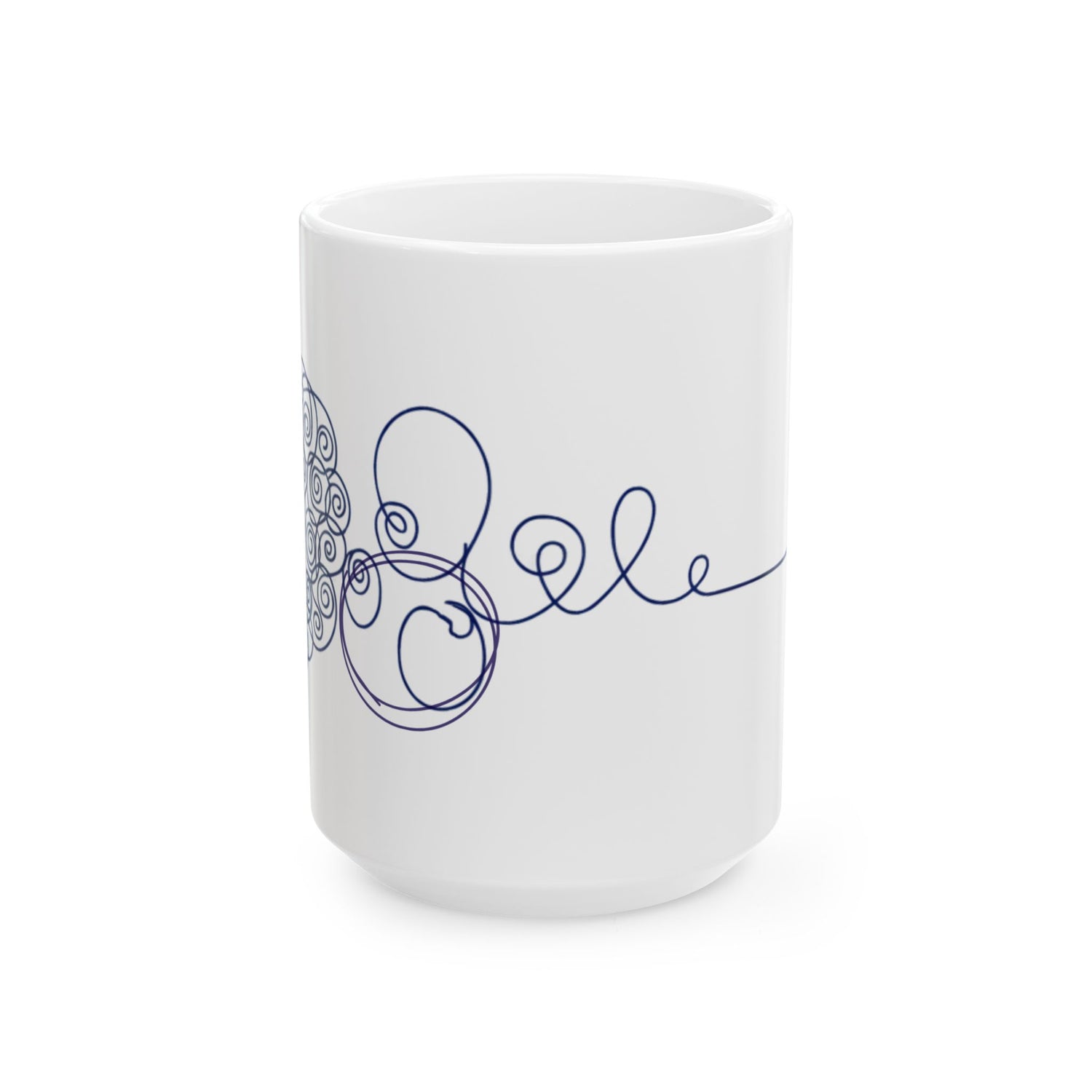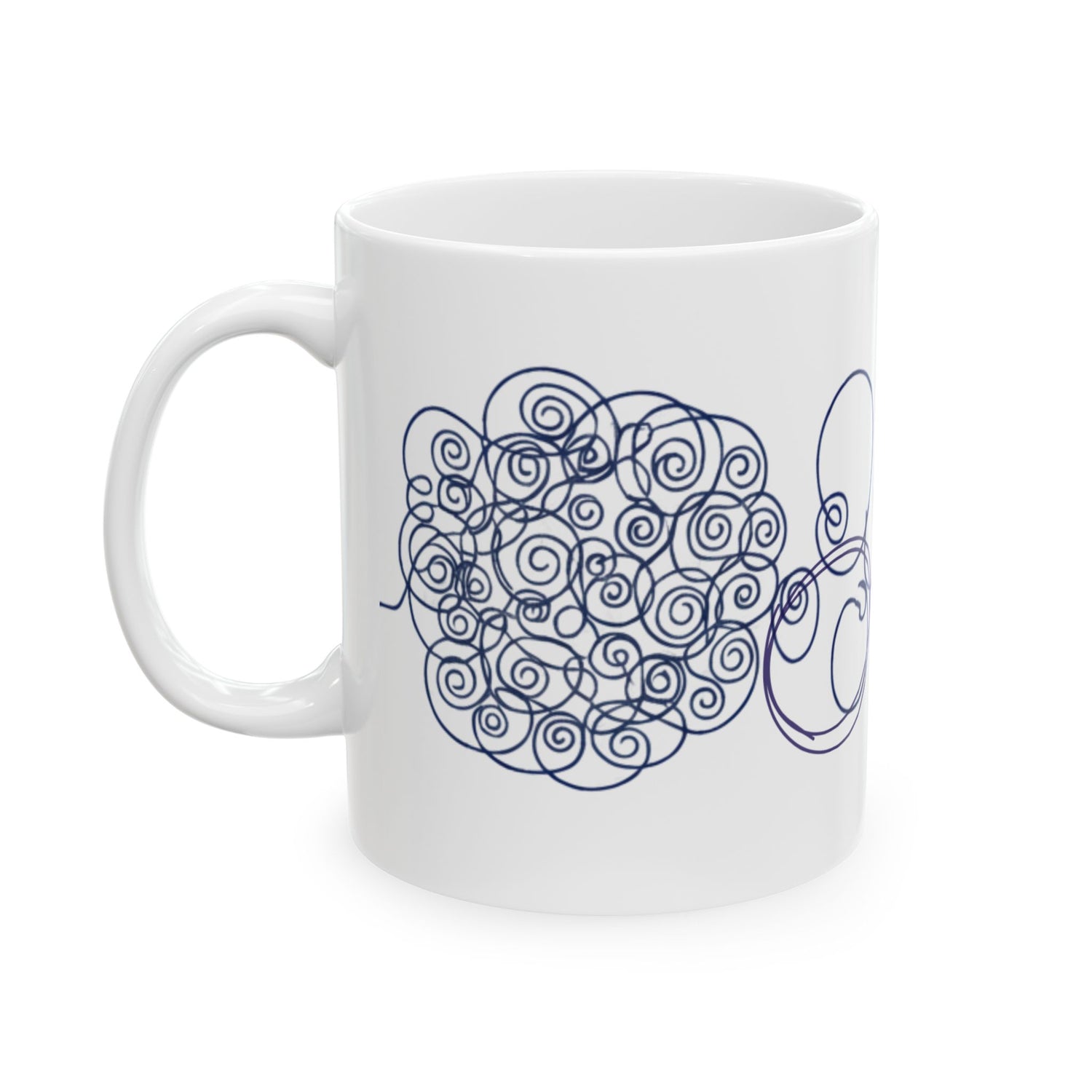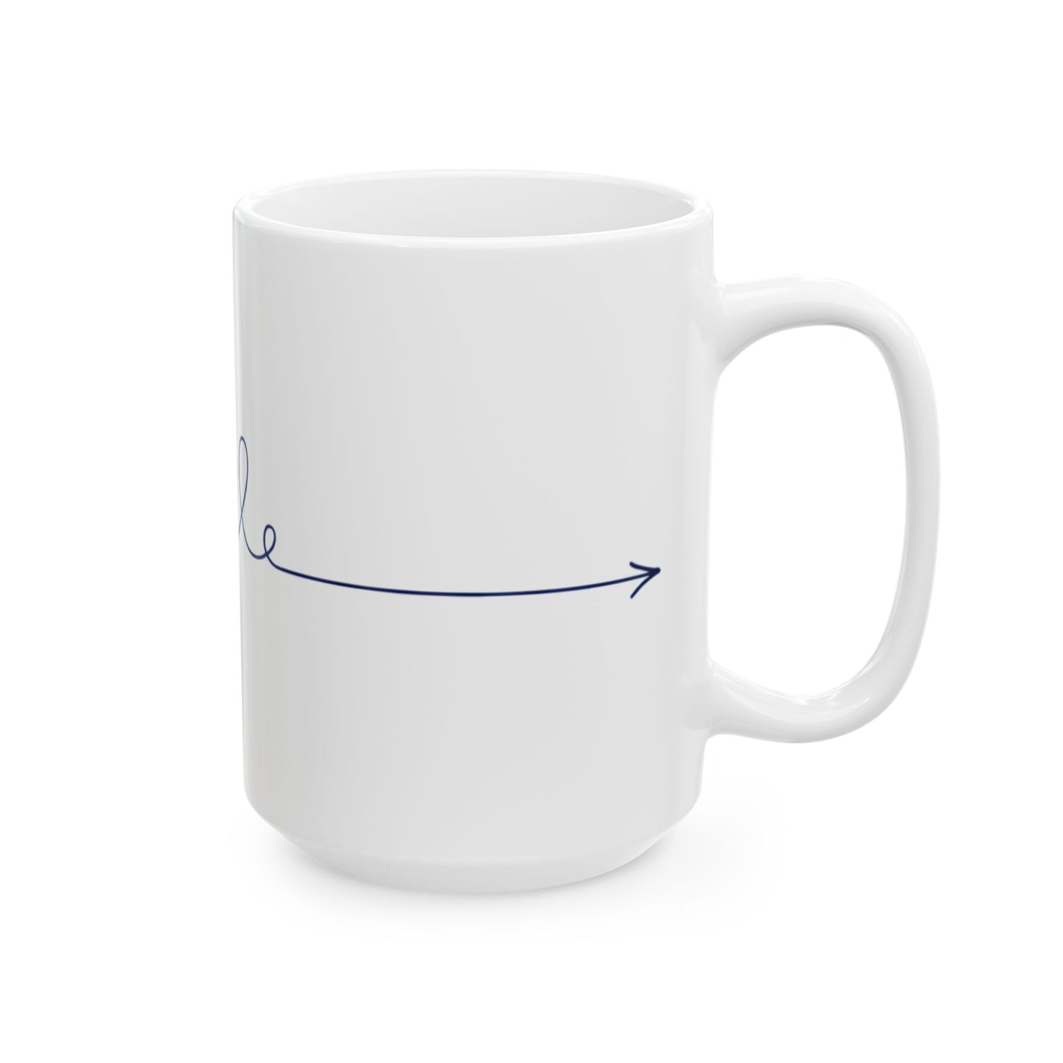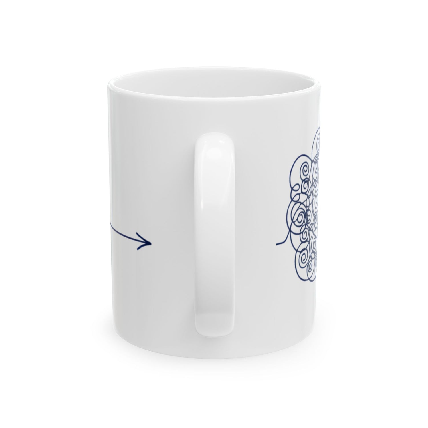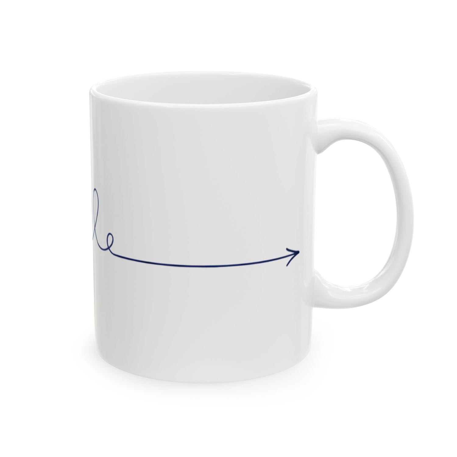 A bright white ceramic mug stamped with a playful, continuous-line teal illustration. The design snakes around the cup in a single flowing stroke — a doodled bloom on one side, a looping script-like flourish across the middle, and a small arrow near the handle. It feels lighthearted and calm: the steady teal line brings a quiet rhythm to morning coffee, afternoon tea, or a desk-side water refill. The glossy finish makes the color pop, while the comfortable C-handle keeps it easy to hold during slow mornings or quick breaks. This mug slips seamlessly into the routines of studio artists, note-takers, and anyone who loves hand-drawn details — use it during sketch sessions, cozy weekend journaling, or when you need a small, cheerful pause in a busy day.