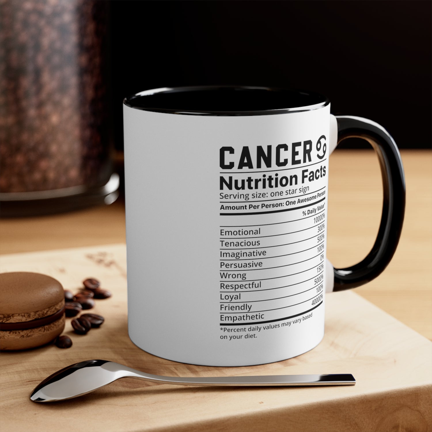 Cancer Star Sign Nutrition Facts White Black Accent Ceramic Mugs 11oz, Zodiac, Astrology, Celestial, coffee mug, tea cup, joke, funny, humorous, fun