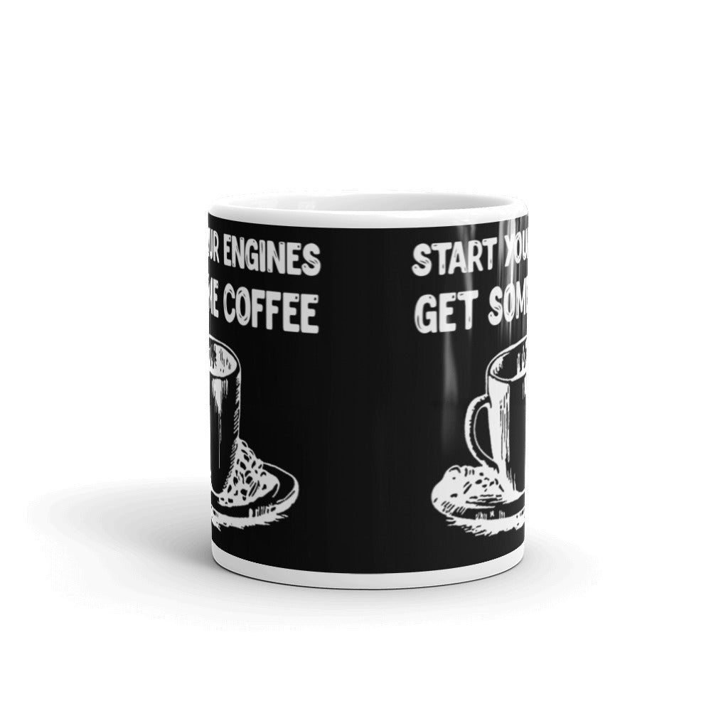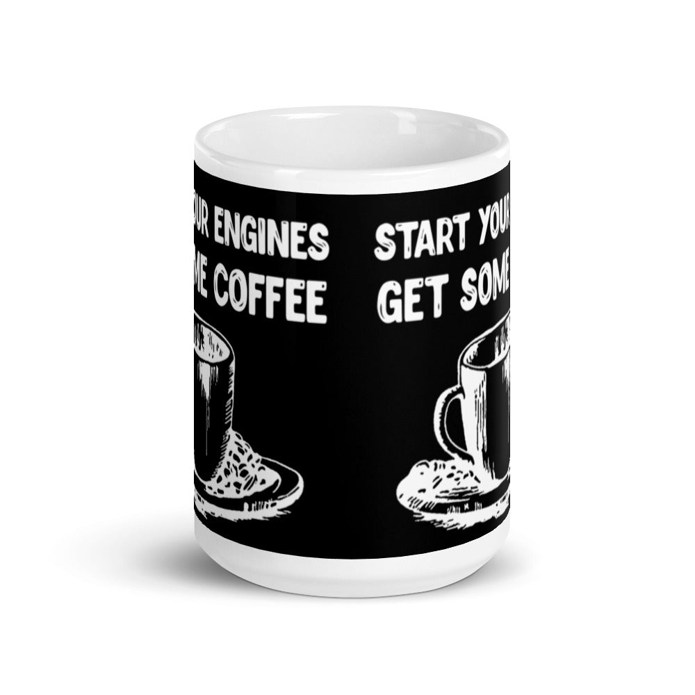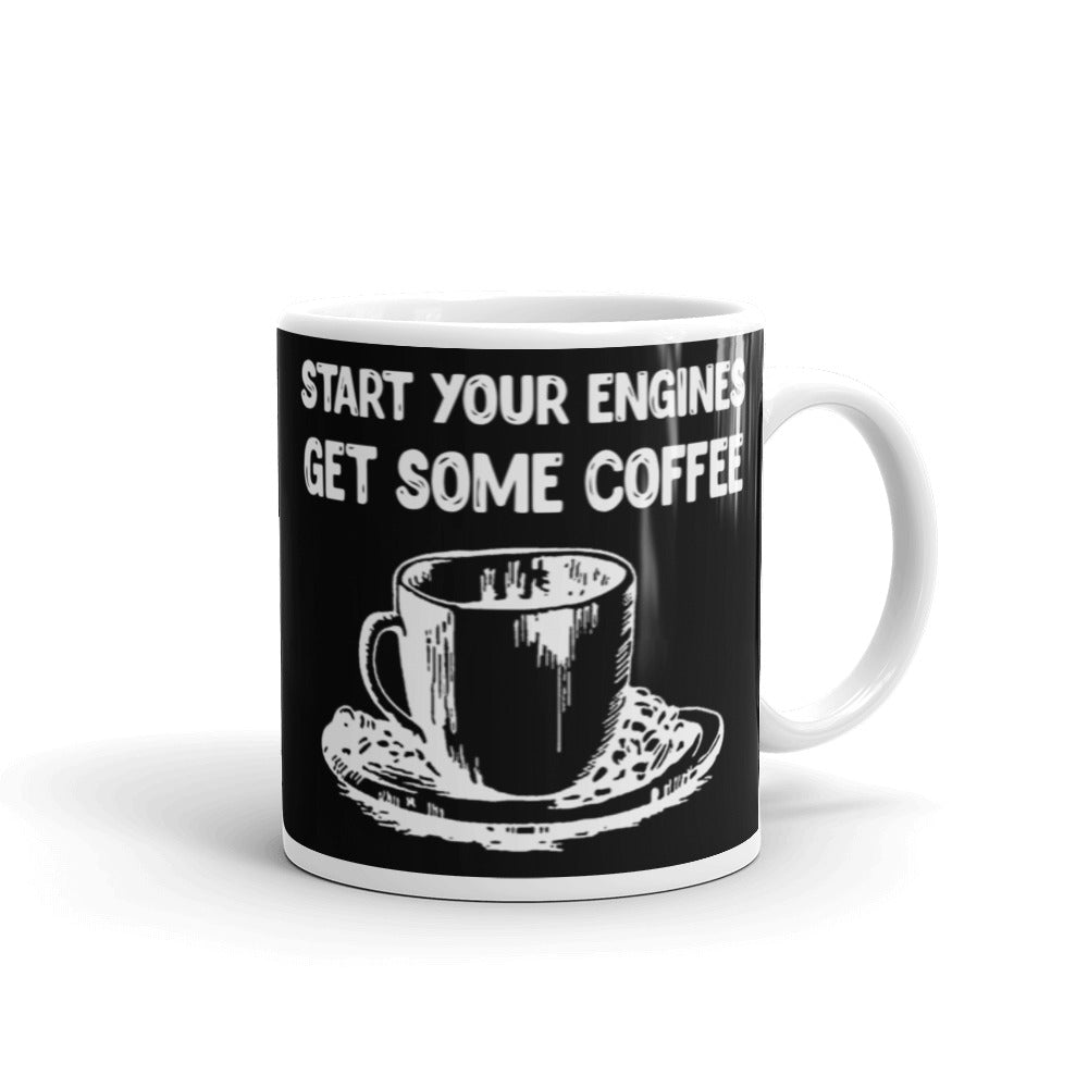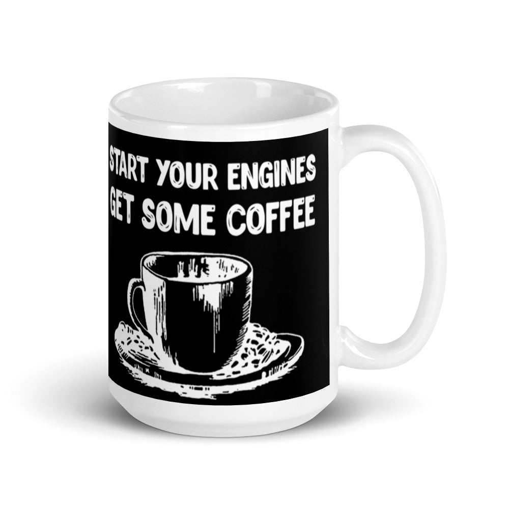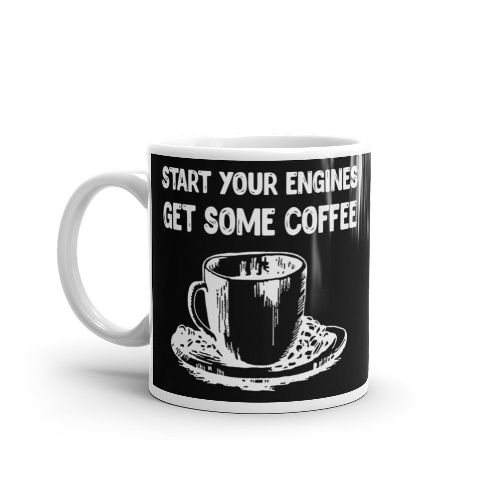 Start Your Engines Get Some Coffee (Black) White glossy mug