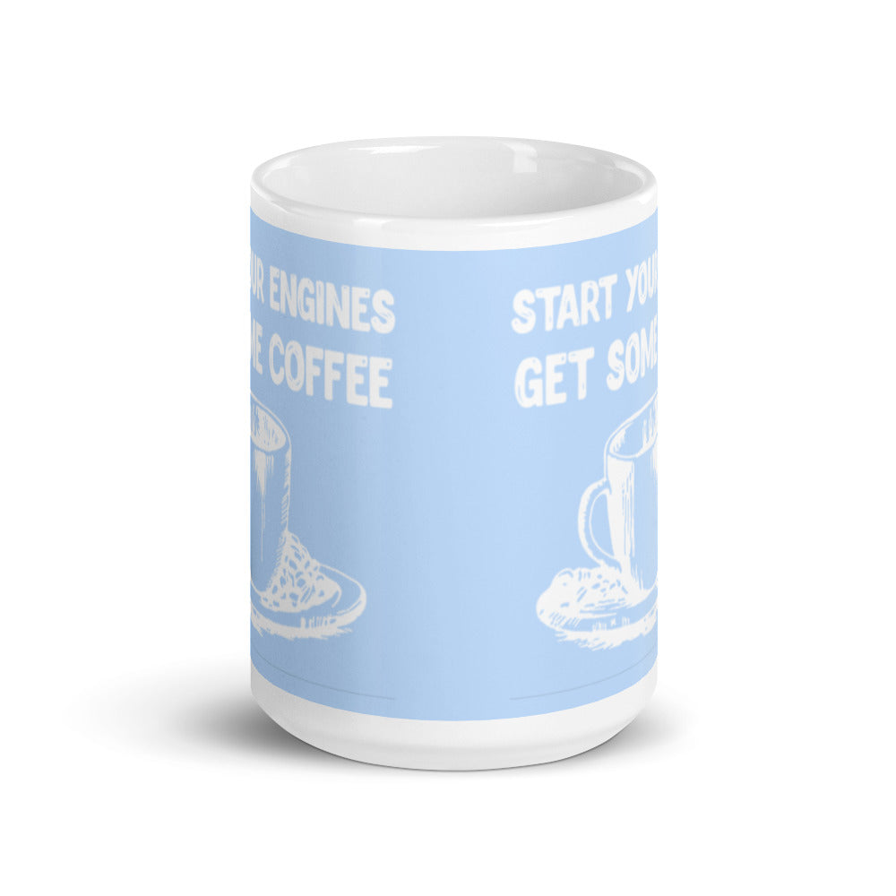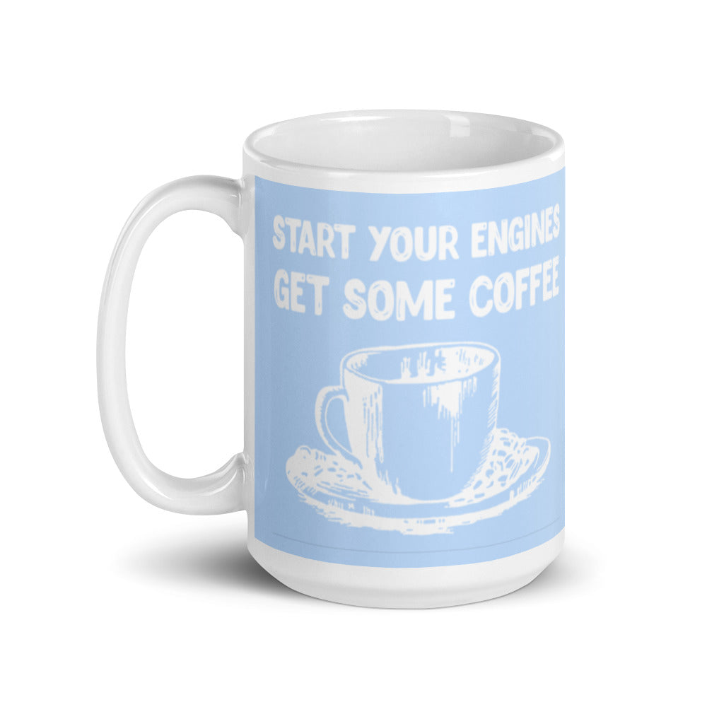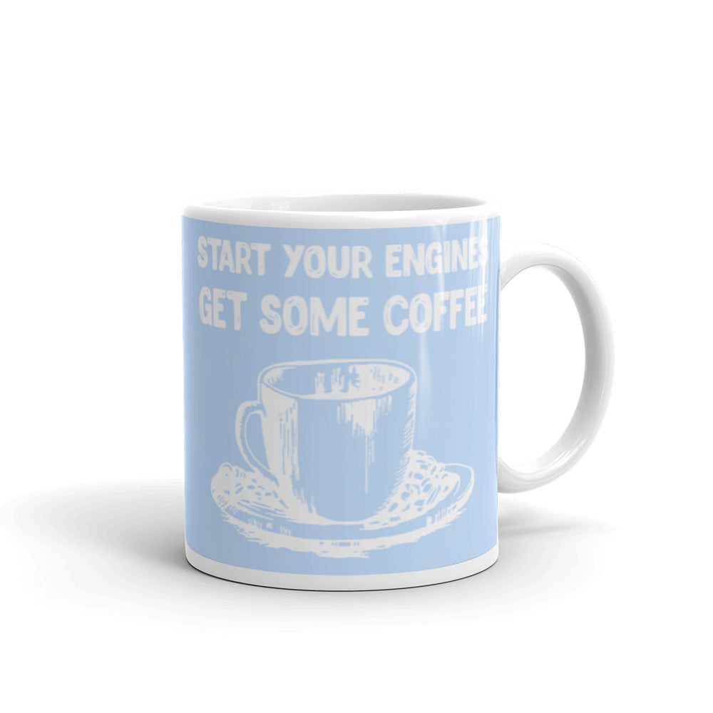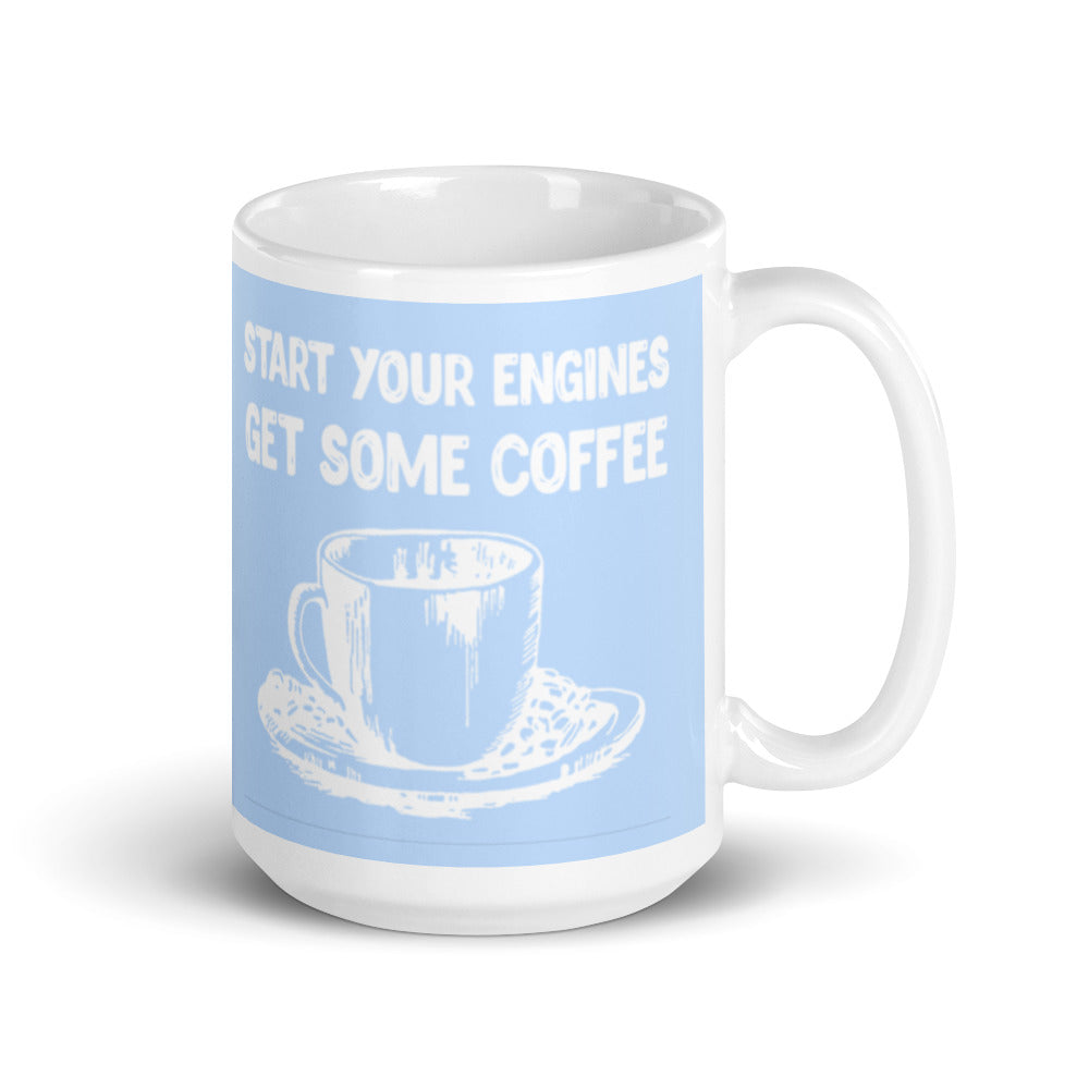 Start your Engines Get Some Coffee (Blue) White glossy mug