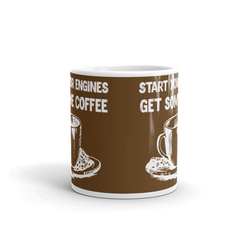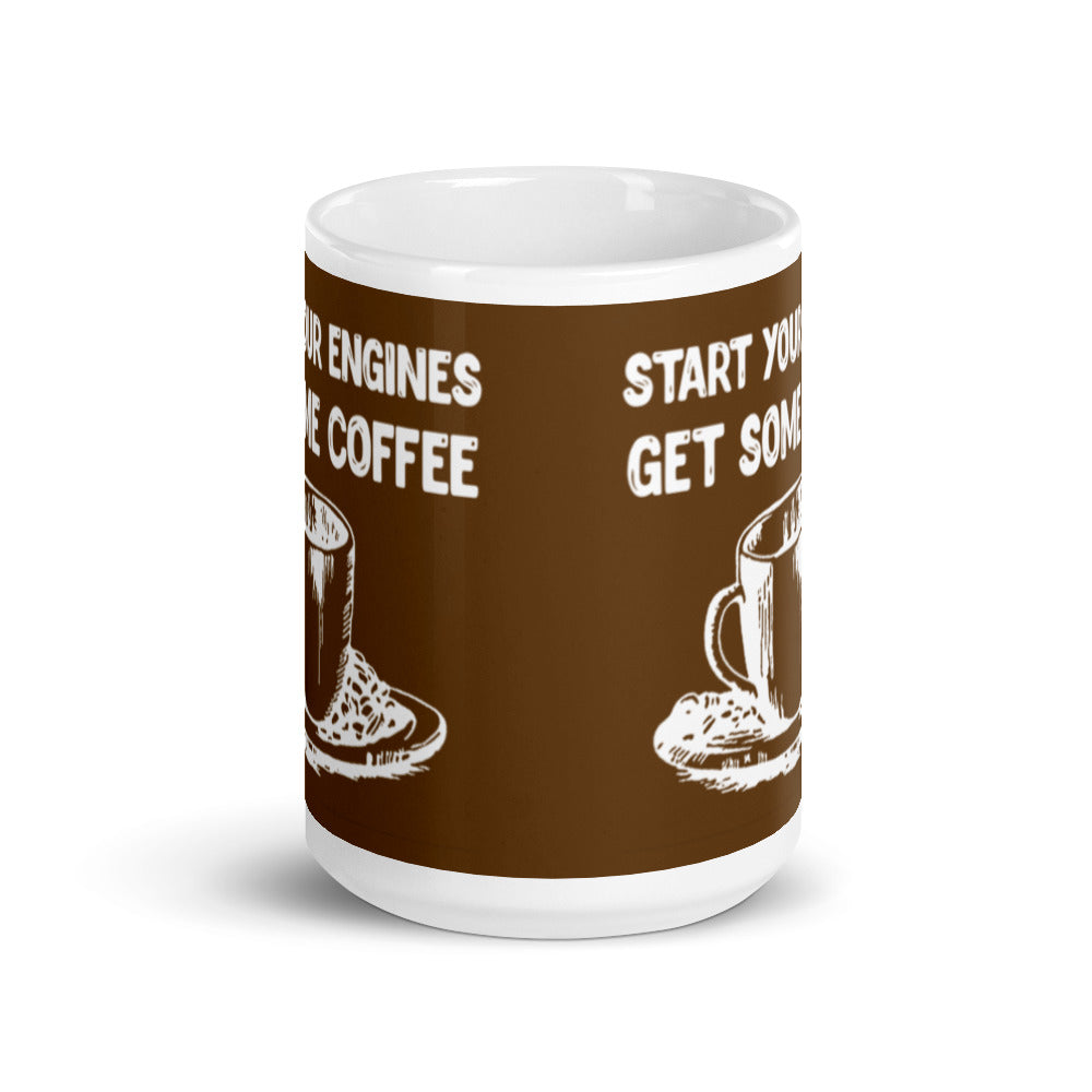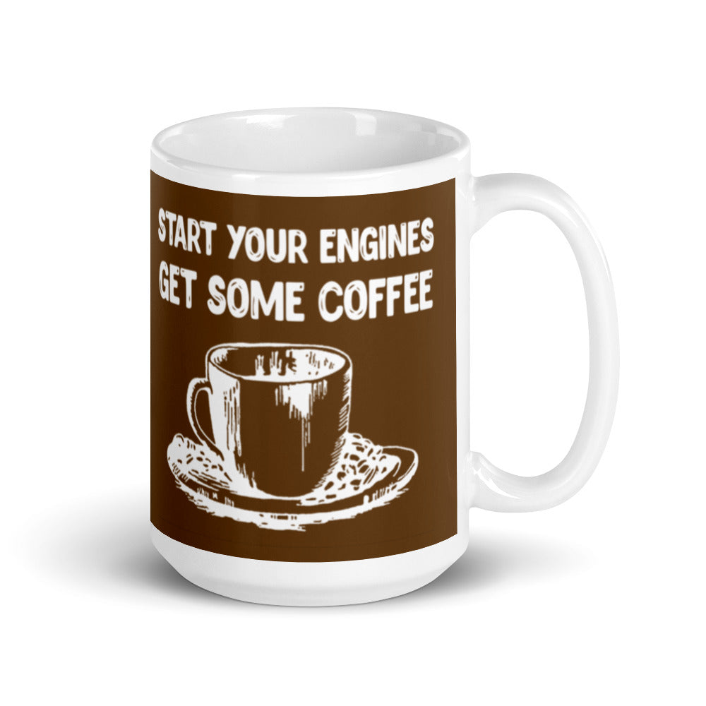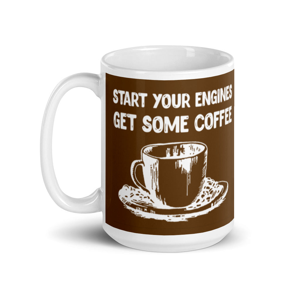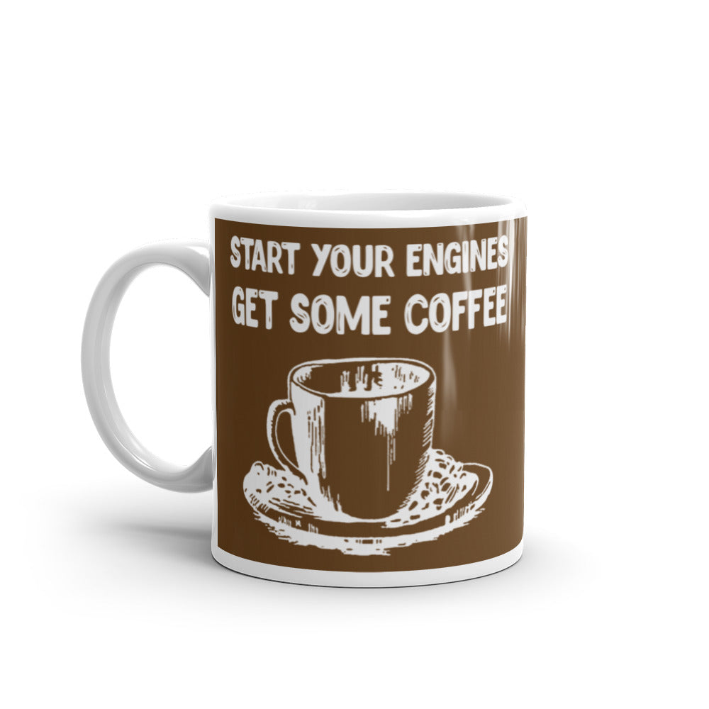 Start Your Engines Get Some Coffee (Brown) White glossy mug
